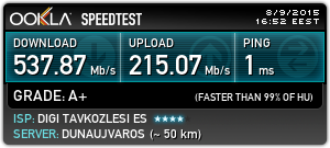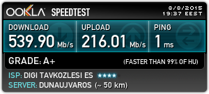 Szerk.: a békesség kedvéért mértem egy újat, a változatosság kedvéért a digi saját mérőjével. Itt bőven megvan a névleges (218/104), így megismételtem a speedtest-es mérést, ami kielégítőnek nevezhető: 218/96. Szóval reklamálni nem nagyon van okom...