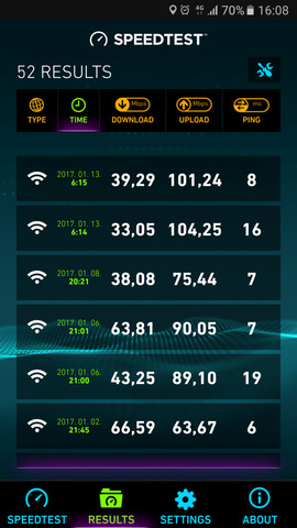 Amikor sebességet mérek, akkor a letöltés általában 30-60 Mbit a feltöltés pedig 60-104 Mbit között ingadozik.
