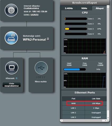 A dobozkából a routerbe dugva az Asus router szoftvere szerint csak 100 Mbit jön be: