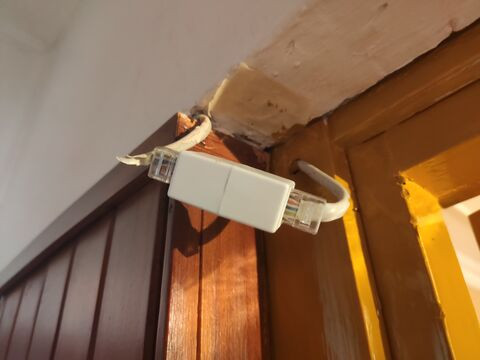 - Toldalékkal az ajtókereten belül, illetve a falon lévő kábelcsatornákon keresztül egy hosszú CAT 5e kábel egy dobozkába torkollik.
