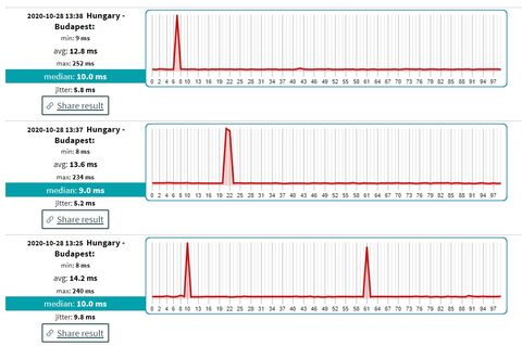speedmeteres ping teszt. budapesti meg szlovák szerveren teszteltem, mindkettőnél ugyan az az eredmény: ha vagy 5× lefuttatom a tesztet, abból legalább 2 teszt alatt minimum 1-2× felugrik a ping a normál értékekről 300ms fölé egy pillanatra.