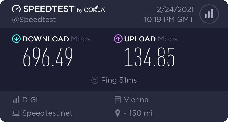 Result URL: https://www.speedtest.net/result/c/111619d6-d649-45eb-9dd9-e0719327c158Most ennyit mértem vezetéken, azért 900 körül el szokott érni, de ez is teljesen jó még.