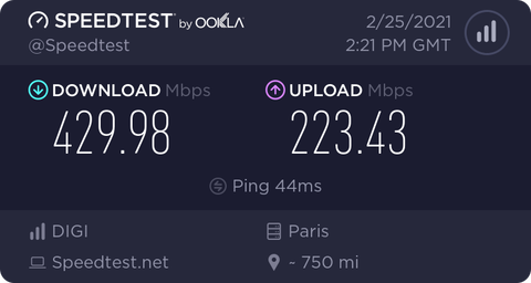 Hétfőn kötötték nálunk az optikát. Azóta néhányszor mértem különböző időpontokban, de 400/250 fölé nem ment kábelen egy Asus RT-AC65P routeren keresztül. Egyszer megpróbáltam direktbe kötni a gépre az ONT-ról (cat6 kábel), de akkor kb. fele ennyi volt a sebesség. A garantáltat hozza, de ennél azért többre számítottam.