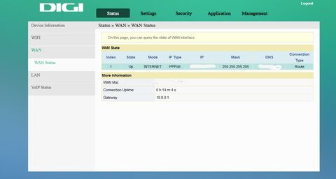 A menüjében a WAN részen csak ennyi van:Mikor megszakad és új IP-t kap, akkor az uptime is indul nulláról. Mint látható csak 14 perce megy, ekkor állítottam vissza az ONT eszközt bridge módból. A "menetrend" szerint kb 1-2 órán belül új IP lesz itt és az uptime újraindul. Mindjárt kiderül.