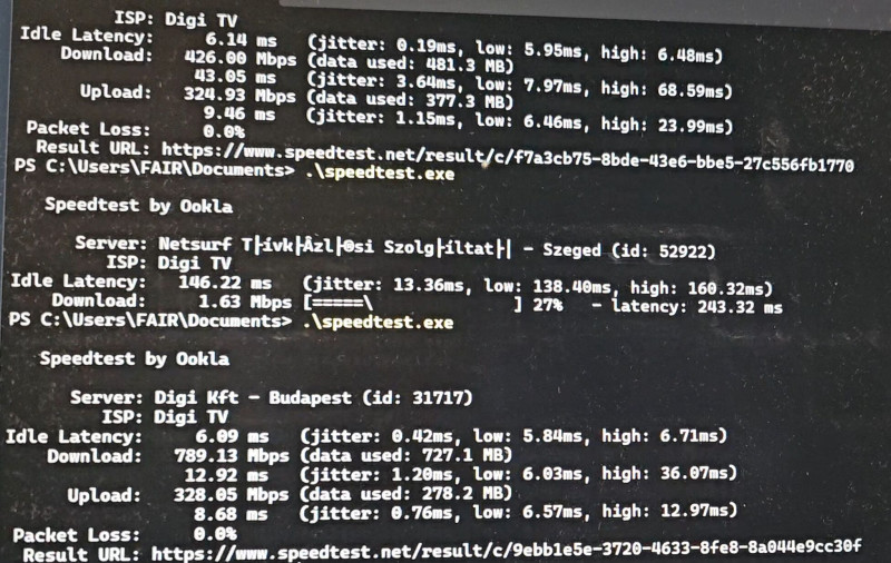 Még tesztelem az új setup-ot, az eddigi 3 külön eszköz (ont + tv cucc + wifi6 router) helyett most csak az új ont üzemel. Gondoltam adok neki egy kis időt , és ha tudja az alap dolgokat akkor nekem felesleges egy külön utána kötött router. Eddig nem olyan szar, ami nagy negatívum nekem a UI felület. Borzasztó kezelni (UX-UI tervezéssel foglalkozom, nekem ez eleve fájdalmasabb mint átlag usernek). A belépési jelszót újraindítás esetén eldobja, de ez nem zavar a többi beállíásom eddig érintetlen maradt. Sikerült a port nyitás is. Ami hiányzik pl az előző tplink-ből a 2G/5G wifit egyben kezelje, mert így a jelerősítővel együtt a lakásban 4 külön wifi megy, erre még nem találtam megoldást, ( ezekhez annyira nem értek ) illetve nem találtam normális kezelési útmutatót sem. A jelerősség nekem elég, kicsi a lakás nem kell hozzá komolyabb cucc. A PC kábelről megy 8/900Mbps a Wifi eszköz függő, a telók a legjobbak otthon azokra rámérve ott is megvolt a 800Mbps átlagosan. Torrentek futnak, Call of Duty Open NAT-olva