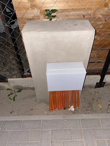 A telken egy ikerhaz es egy sorhaz van, osszesen 6 lakas. Mindenki digit szeretne, es ezt a digi tudta, ezert epittetek velunk egy kedves kis elosztoszekrenyt a telekre, ahonnan mindenki garazsaba megy egy cso (kep mellekelve), tehat mas telekreszen max a fold alatt menne vegig, de a cso osztatlan kozos tulajdonban halad.