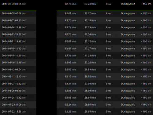 Hozzám amikor hozták a ZTE routert, már aktív volt az emelt sávszélesség. Bekötötték az eszközt és utána futtattak egy tesztet. Ki is derült, hogy nem megy 100 fölé a letöltés. Miután megmutattam, hogy alig 1 éves az asztali számítógép amin lefuttatták a tesztet, előkapták a kábel teszterüket. Ez gyorsan meg is találta a hibát, amit kijavítottak. Azóta ezt hozza stabilan, a hét minden napján: