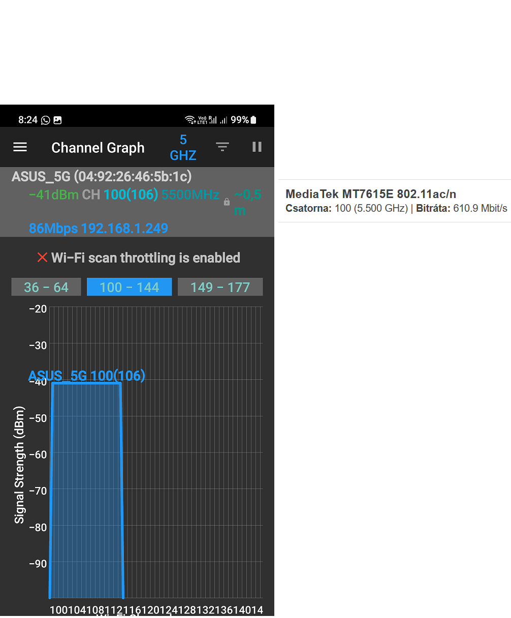 Köszi mindenkinek! Kár, hogy a Huaweiel kisebb lett a hatótáv. Egyébként az tudja a 165-ös csatornát? Régebben volt valami wifi a házban, aminek a jele erősebb volt az íróasztalomon, mint a saját wifim mellett, azt hittem valami "illegális" beállítás miatt, de most látom, hogy a 165-ös csatornán ment. Lehet az még jobb, mint a 100-as. Ezt már régebben sem értettem, miért mászik el onnan, hiszen nem is azon a frekvencián üzemelnek a meterológiai radarok.