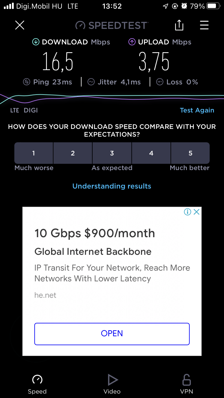 A 20. kerületben nagyon jó a kültéri lefedettség és a Soroksári út mentén a beltérivel sincsen gondom. A sebesség bőven elegendő a szokásos internetezéshez de akár youtubehoz is.