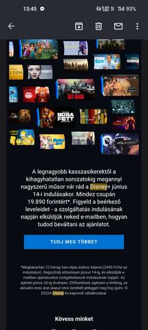 "Mivel jelenleg éves előfizető vagy, az éves Disney+-előfizetésed 2023. június 14.-i dátummal újabb 12 hónapra automatikusan megújul. Továbbra is ugyanazt a jelenlegi 24.900,00 Ft összegű normál díjat kell fizetned a regisztrált fizetési módoddal." -