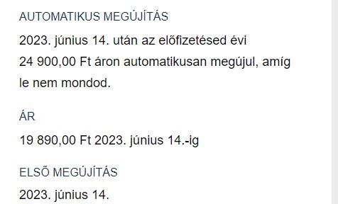jaja, a weblapon korábban már így olvastam... vagy lehet a felületen, mint következő fizetési időpont és összeg. Szóval le is mondtam az éveset egyelőre - ettől persze a kifizetett dátumig megy még. Aztán majd meglátom, hogy alkalmanként egy hónapra, vagy mégis évesre fizetek be. Pár más előfizetésemet is lemondtam / változtattam, mert nagyon elszaladt már a ló alattam