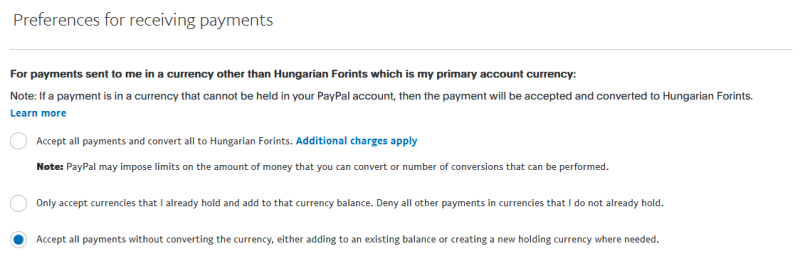 Ez meg ugye a PayPal jól eldugott menüpontja a konverzióról, de ez is jól van beállítva: