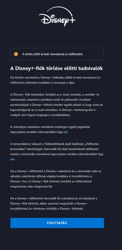 "Ha éves díjcsomagra fizettél elő, és az előfizetésedből még egy hónapnál több hátravan, de szeretnéd lemondani az előfizetést, jelen e-mail kézhezvételétől számított 30 napon belül egyszerűen hívj minket vagy fordulj hozzánk az online csevegésben. A Disney+-előfizetésed, ha nem mondod le, a megújult feltételek mellett folytatódik."