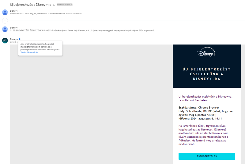Sose használtam a disney+-t, de valamikor még évekkel ezelőtt regelhettem rá, mert most jött egy mail, hogy beléptem, miközben amúgy nem, volt belépésem az Usából, a németektől, Indiából is az elmúlt 1-2 nap alatt, szóval meg kellett volna ijedjek, de nem, mivel semmiféle adat nincs megadva a mailcímemen kívül, s emegrendelt szolgáltatásom nincs, se előfizetett dolog, se bankkártya adat. Cserébe végignéztem a dolgokat, hogy tudnák jelszólt, mailcímet változtatni, a fiókot törölni, de nem létező dolgokat ír. A jobb felső sarokban nekem csak egy kijelentkezés fül van, semmi más. kijelentkeztem mindenhonnan, most megváltoztatnám a jelszavamat, vagy legalább törölném a fiókomat, de ninc sott az a gonb, amiről írnak.