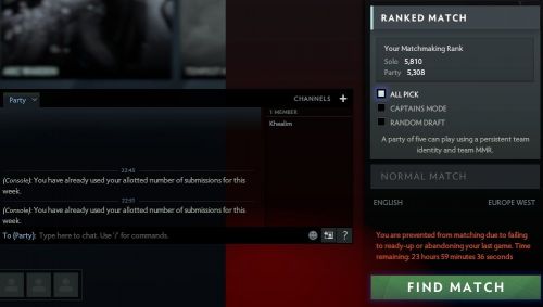 -a hétvégén csak solo only matchmaking volt elérhető rankedon, tehát a party egyáltalán nem volt elérhető, és a normal játékok is átvették a ranked játékok all-pick draft rendszerét. (teszt jellegű dolog valve részéről a mm minőségének javítása érdekben, konklúzió gondolom majd késöbb születik).