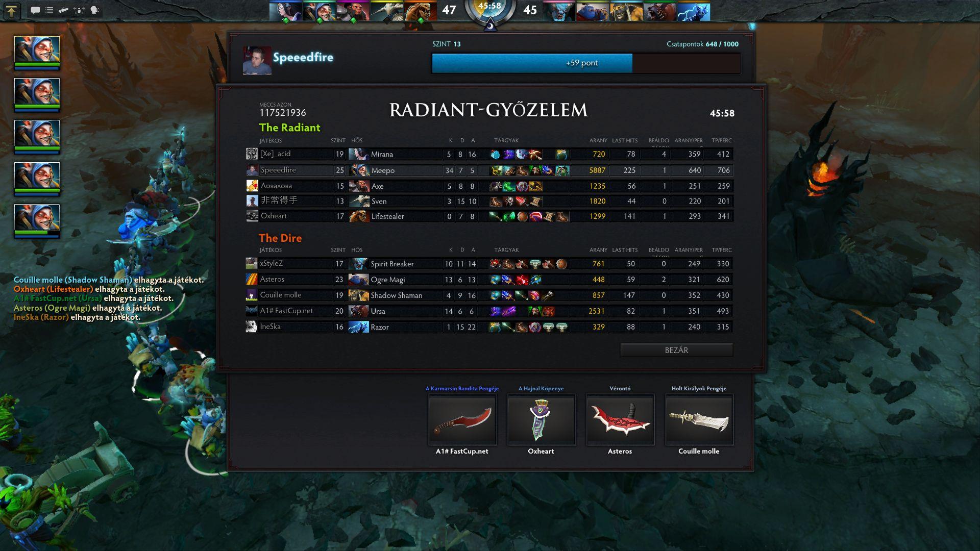 lifestealer, spirit berseker, shadow demon, anti-mage meg én voltam windrunner-rel. Szépen megvárták, míg a sniper felfejlődik, utána meg már semmit sem lehetett csinálni ellenük. 70 perc volt most ez az utolsó meccs...