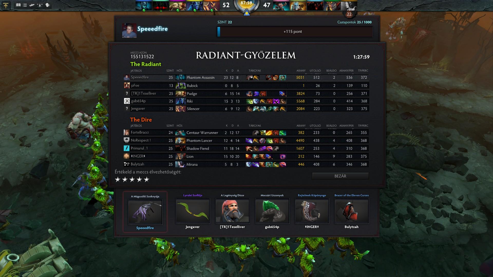 Az arcana boots-al le ment bot-ra, a gg meg mid-en volt. Nekem ott fent kellett az a SR. Így tudtam csak kibackelni a halálokat. Egy stun, aztán go torony alá. Emiatt is szeretem a QB-et, mert meg tudom enni a fát és beljebb tudok menni az erdőben.A cipő kontra fegyverben nem értek értek egyet. Szerintem a 13 perces armlet nem volt rossz.