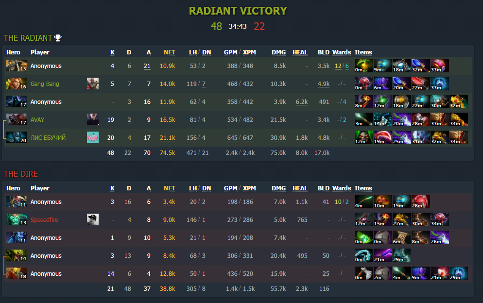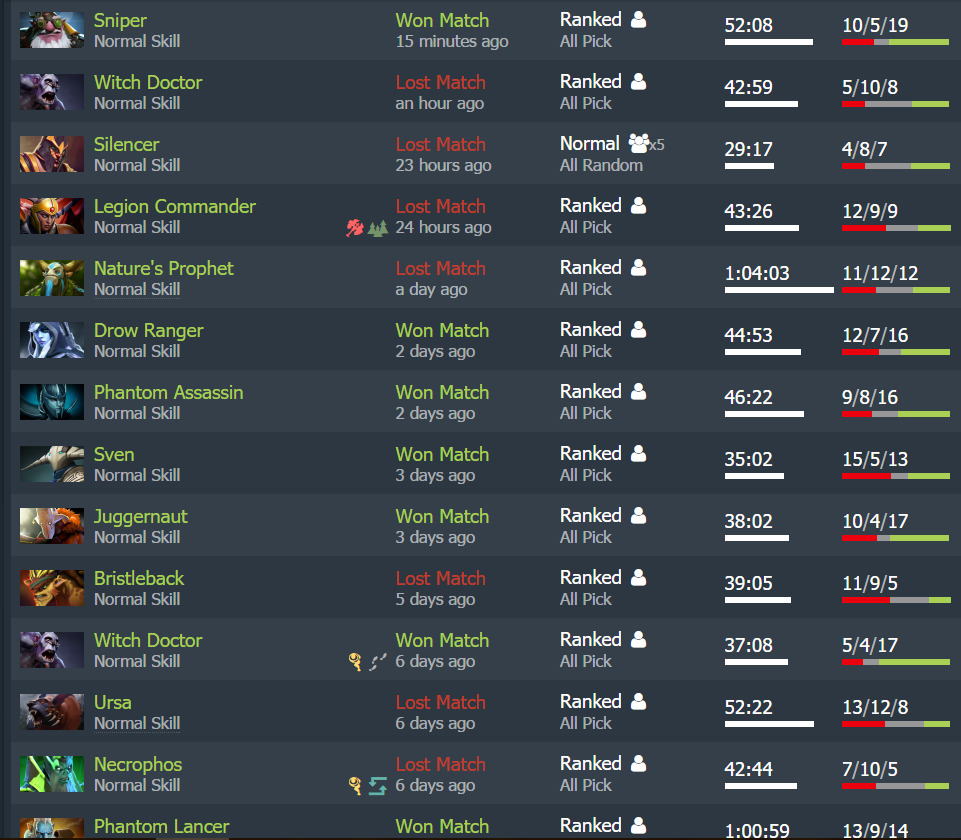 Évek óta játszok már dotát, de egyszerűen low mmr-ben vagyok egyfolytában. Kb mindegy, hogy milyen karakterrel vagyok. Kiszopatnak a csapattársak minket.Utolsó meccs, bs és luna full kretének voltak. De nagyjából ilyen az összes.