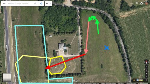 A kék X a pozícióm, a nyilak jelzik a repülési irányt, a kék területet bejártam, a sárga a gép feltételezett helye a lezárt területen.