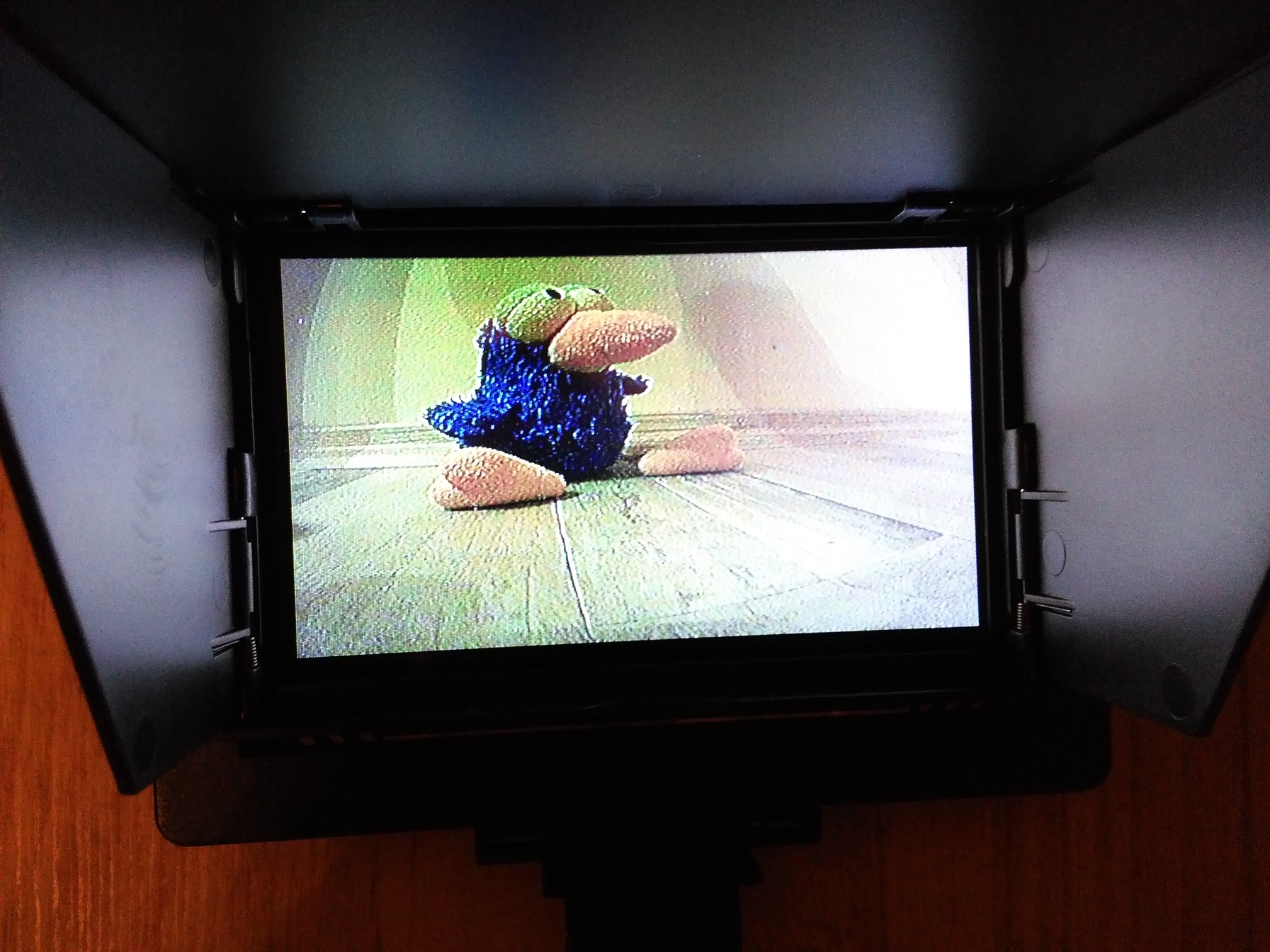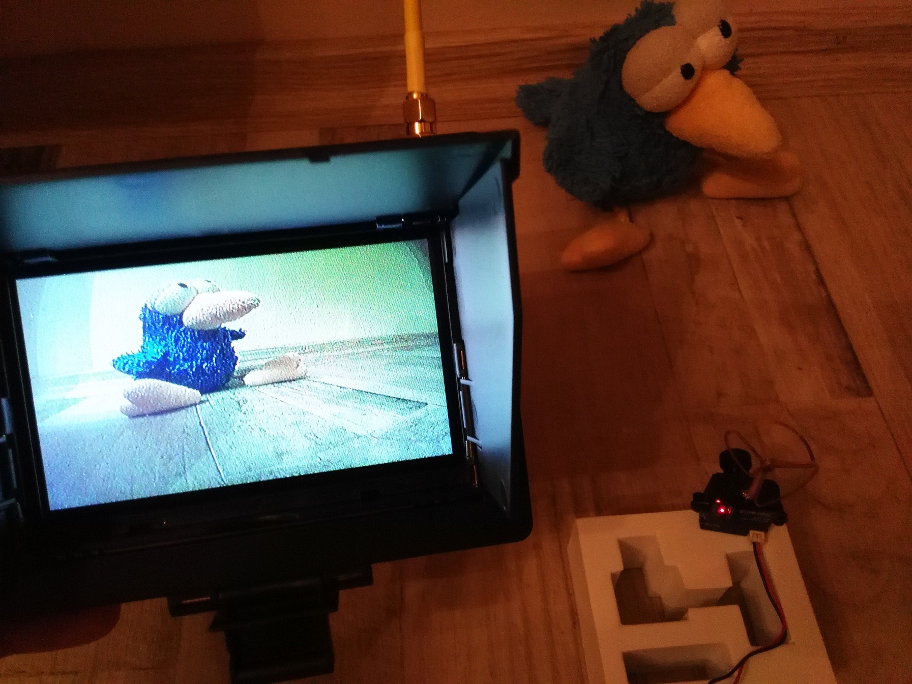 Vevőnek nem volt kedvem előbányászni a szemüveget most, (volt 4 percem az egész tesztre...) így gyorsan előszedtem az akciós V666 FPV kit monitorját beépített vevővel, ráraktam egy RHCP gombát, és elkezdtem vakarni a fejem... (ja, feltűnt valakinek, hogy az RHCP rövidítésre a google a Red Hot Chilli Peppers-t hozza fel találatnak?