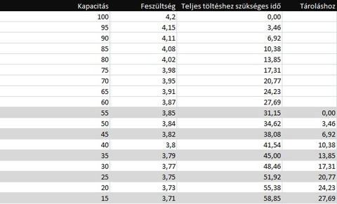 Nem tud valaki egy oldalt linkelni, ami tartalmazza a feszültség értékekhez tartozó töltöttség képletét? Készítenék saját használatra egy progit mobilra, amibe beírom a jelenlegi feszültséget, az akkumulátor kapacitását, esetleg a töltési áramot, ezután kiszámolja hogy hány percet kell töltenem a Tárolási feszültségig vagy a teljes töltöttségig.