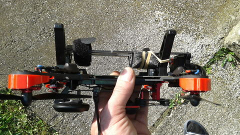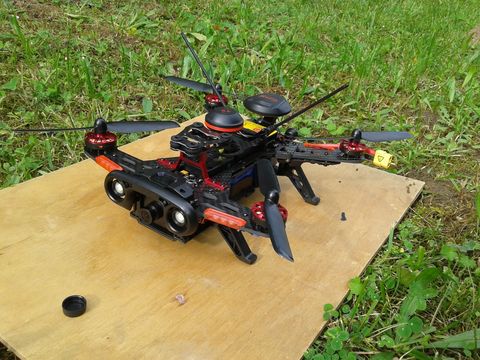 Mivel elég idegesítő volt, hogy a kis légypiszok QX90 ha lemerül, akkor így jártam és valahol éppen tőlem - tököm tudja, hol - leesik, aztán keresgethetem, ezért forrasztottam rá egy vinnyogót. Kora tavaszig nem volt annyira gáz keresgetni, mert nem nőtt semmi, de most már ugye igen nagy gazhalmok vannak. Szépen vinnyog is, ha kell, nem merül alá az akku és meg is találom. Szal pár hete, egyik kevésbé szeles napon (volt olyan?) egy driftelés alkalmával kiugrott elém egy fa a nagy büdös semmiből, koppant szegénykém, aztán elhallgatott. Felvettem, látszólag semmi gondja nem volt (most sincs) feldobtam és repültem tova...