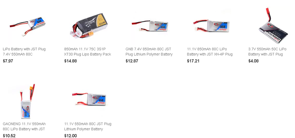 Példa, Gaoneng vagy GNB akkumulátor, amit egyre többen használunk. 850-es XT30 3S áramforrást kerestem, de nem találtam, aztán kézzel végignéztem a szekciót, és láss csodát, van. Kigyűjtöttem nektek egy képernyőképre, hogy lássátok, van egy rakat cucc, csak nincs benne a nevében hogy Gaoneng vagy pl. Tattu:"