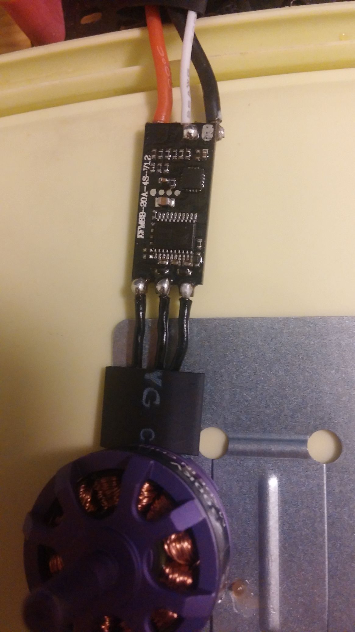 Próba. A gép érdekes hangokat hallat,furcsán vonyít az egyik motor,lebegni próbálok (stab),de összevissza kapkod.Leteszem,jobb hátsó motor melegebb mint a többi valamint az esc-je forró.