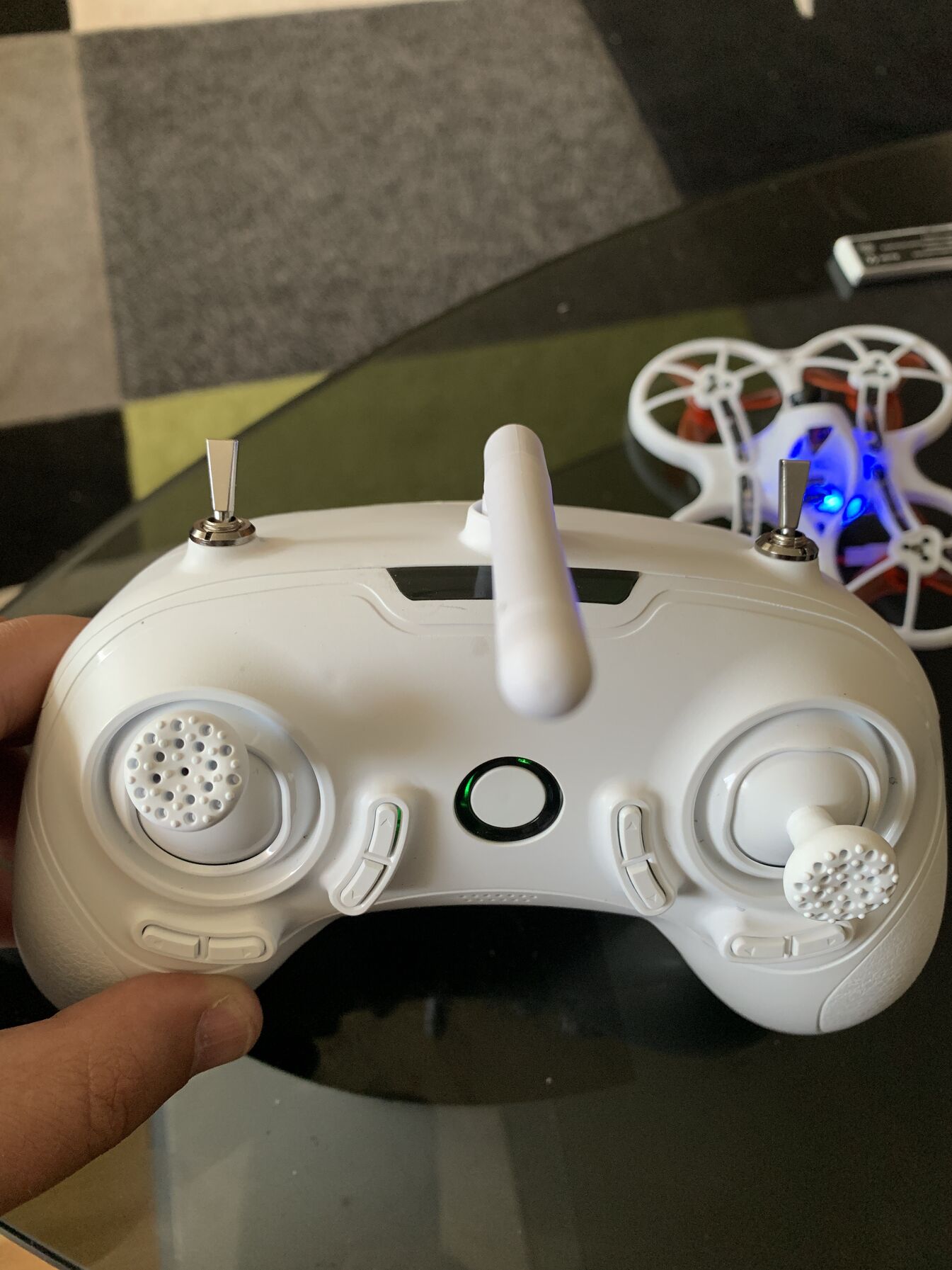 Bekapcsolom a távirányítóAztán össze dugom a dron az aksival az csipog aztán villog kék /piros
