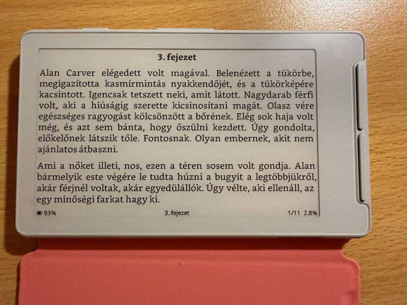 Mondom, ezt csak azért kértem kölcsön egy hétre, hogy teszteljem magam, mennyire tudok olvasni e-ink képernyőn, mert mobilon, monitoron, TV-n kb. semennyire, folyton elveszítem a sort, zavar a "világos" felület, stb. OK, híreket, cikket persze elolvasom "normál" kijelzőn is, de könyvhöz nem fognék hozzá.