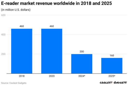 Az ebook olvasók aranykora 2011-ben volt (több mint 23 milliós eladás). Öt évvel később már csak 7 millió fogyott. 2011-ben még nem nagyon voltak tabletek, az okostelefonok pedig drágák voltak, és aprók, azaz az ebook olvasóknak lényegében nem volt alternatívájuk. (Arról nem is beszélve, hogy megoldották, hogy számítógép nélkül is lehessen elektronikusan olvasni.)