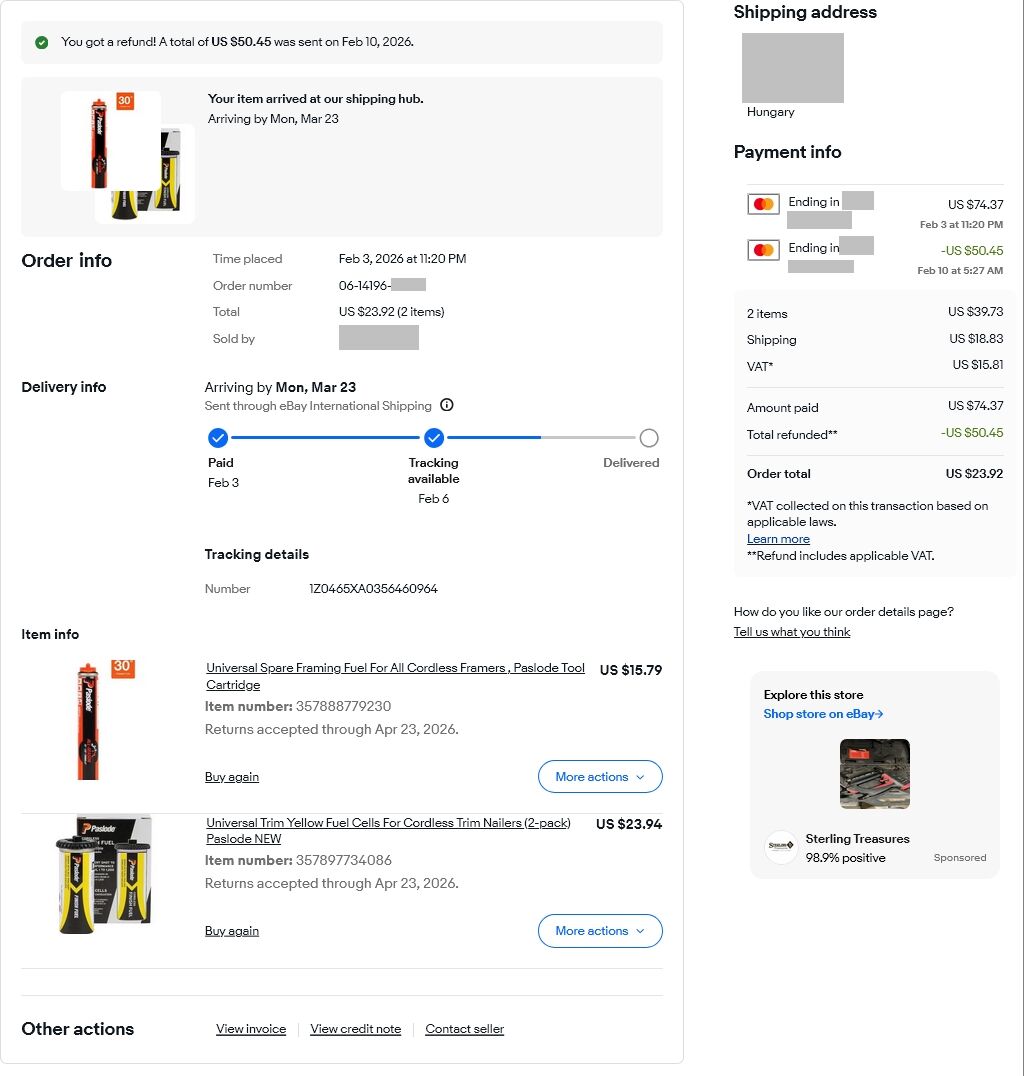 Vásároltam USA-ból 2 terméket ~75 USD értékben feb.3-án, az eladó írt feb 9-10, hogy sajnálja, de