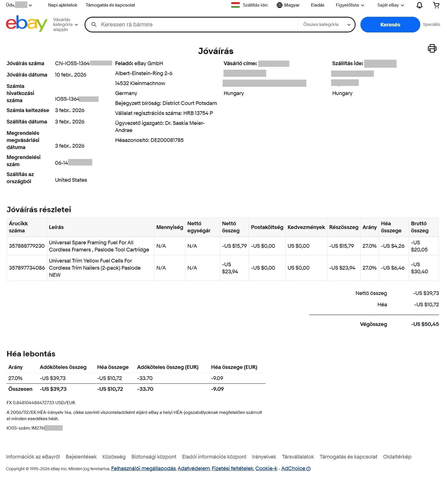 Hogy mennyi legyen visszaadva azt az eladó adja meg és így az eBay-is a kevesebb áfát adta vissza. -