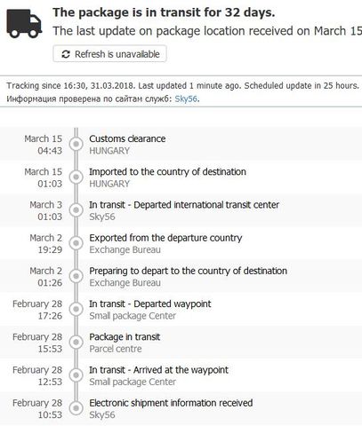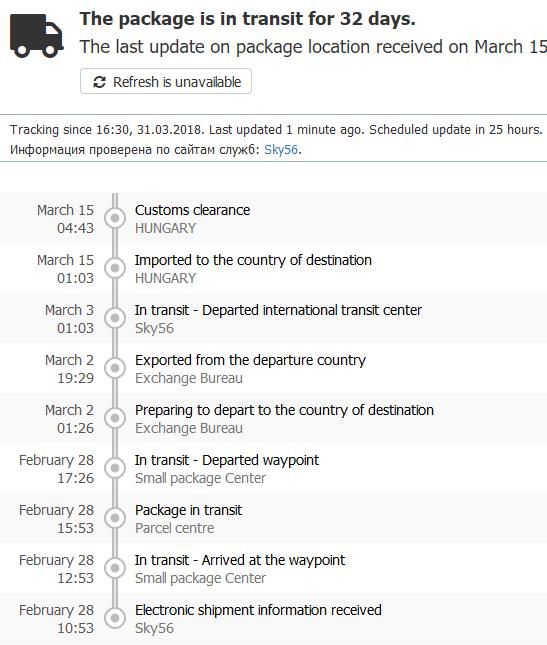 De hiába érkezik ide gyorsan nekm legutóbb(múlt éten) 20 napig tartott a nem váemeljárás alá tartozó küldemény vámolása és kézbesítés az ideérkezés után. Most is van amit megérkezett 5 napja, de még mindig a Nemzetközi Kicserélő Központba várja, hogy valaki foglalkozzon vele az már csak 04.04.-én hoznák ki legkorábban. -