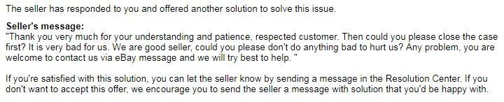 "Please open the ebay case and we will refund it immediately."