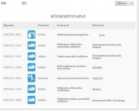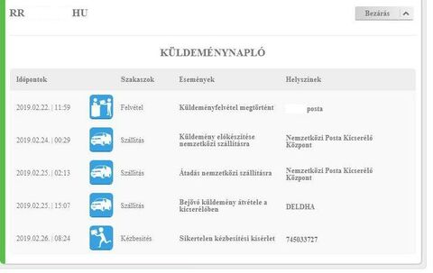 Az egyéknél mindkettő mutatja az átvételig az információkat, a másiknál viszont az ebay és a posta.hu is megállt a kézbesítési kísérletnél. -