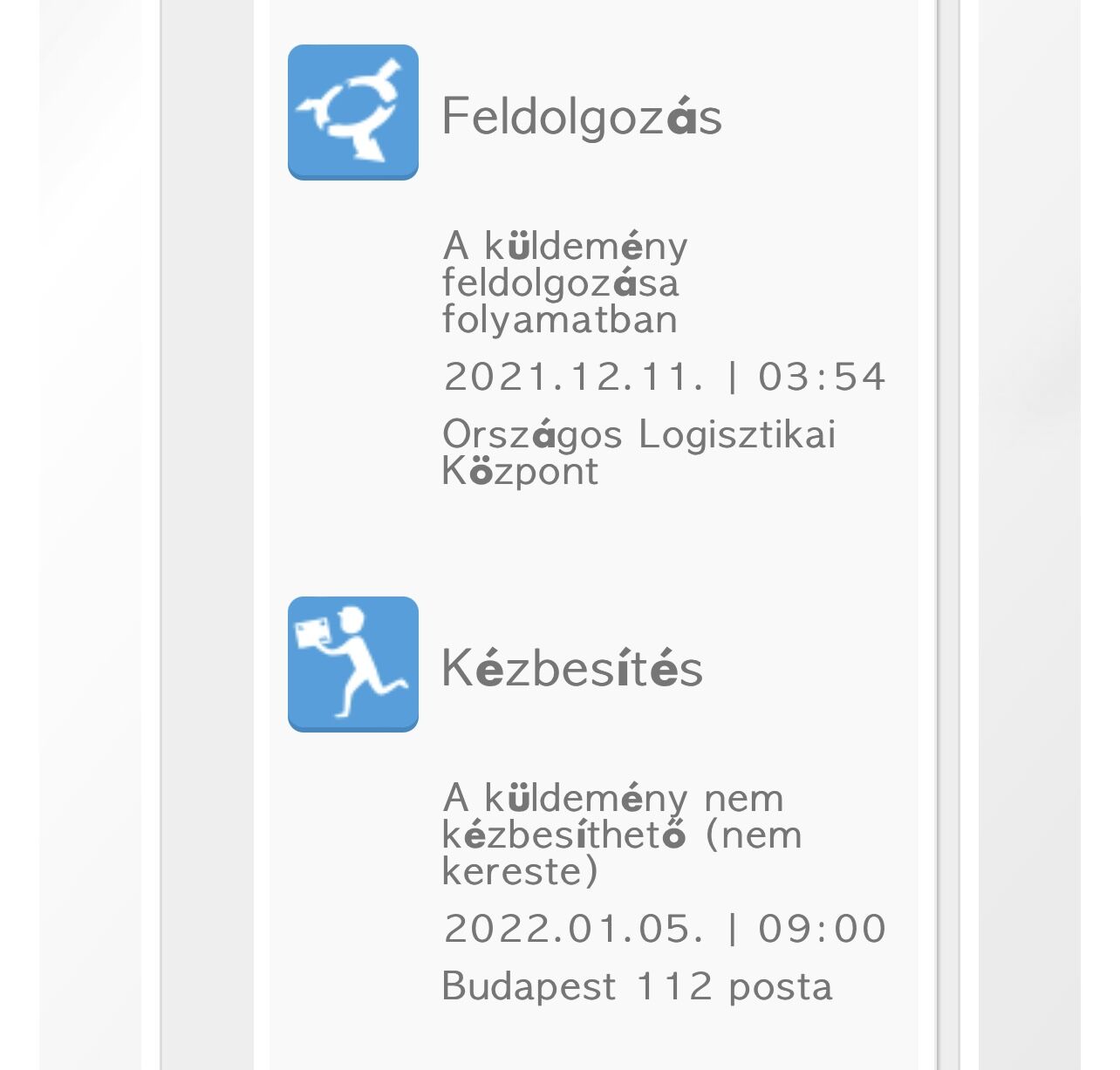 Járt már valaki így? December 7.-én adtak fel egy Ebay-en rendelt csomagomat Németországból. Kaptam Tracking numbert. Az utolsó bejegyzés 12.11.-én volt, “Feldolgozás …. Országos Logisztikai központ” szöveggel. Ma lett egy új szöveg: “A küldemény nem kézbesíthető (nem kereste)” szöveggel. Semmiféle értesítőt nem kaptam. Ilyenkor vissza is küldik?