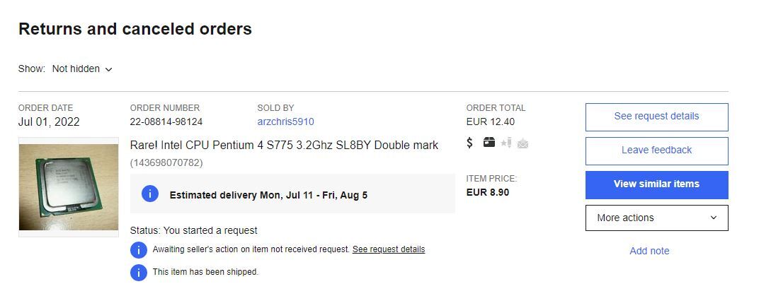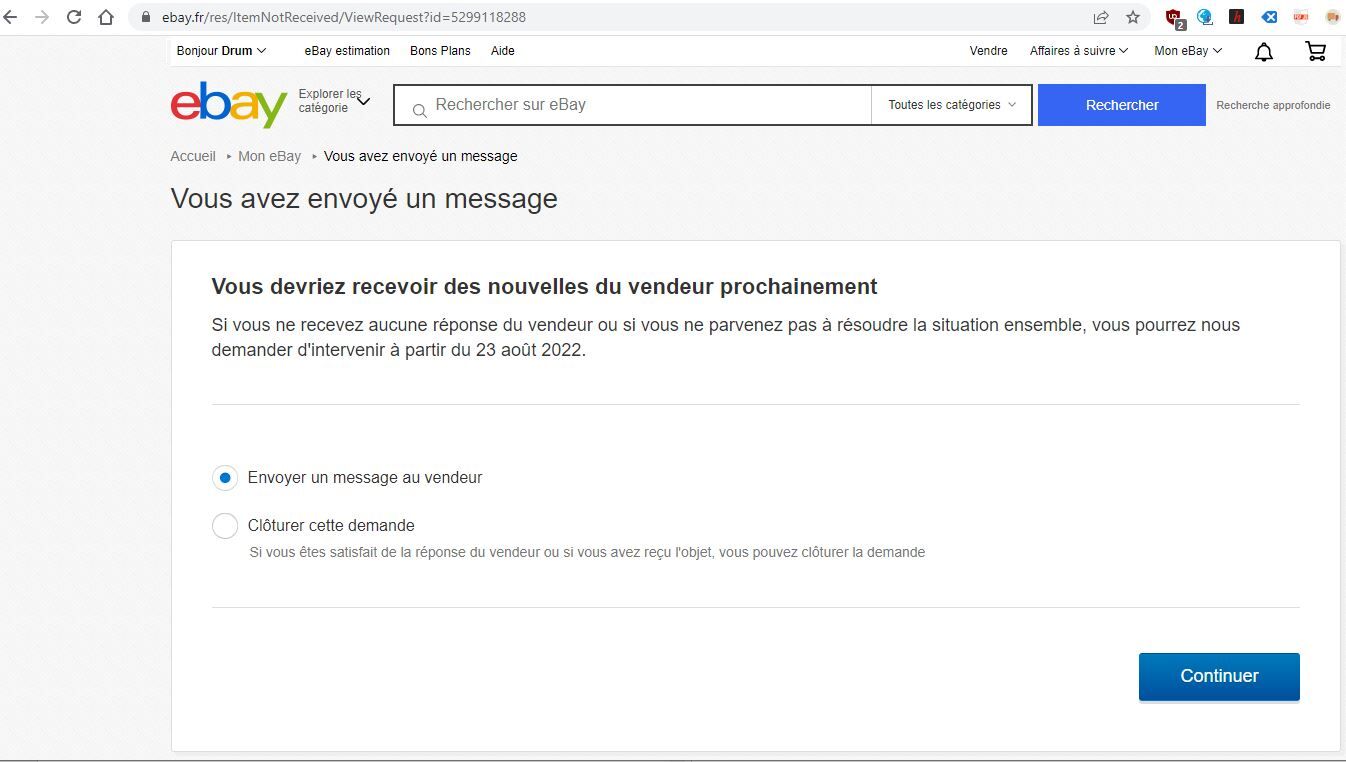 Volt egy proci ami nem érkezett meg, ezért nyitottam egy dispute-t viszont ha a see requrest details-re kattintok akkor átdob a francia ebay-re ami nem lenne feltétlenül gond mert elnavigálok fordítóval de nem látom az elküldöttek között az üzenetemet habár kiírja hogy üzenet elküldve. (trackinget szeretnék kérni tőle, mert szerinte el lett postázva a cucc, esélyes hogy elveszett)