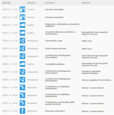 Ezek láthatóak a Magyar Posta követőjében is. Ha valami más forma küldemény azonosítód van ahhoz még tartozhat postai is és az általános keresők annak a bejegyzéseit írják ki. -