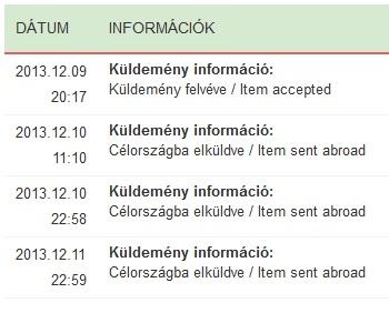 5-én 17 órakkor adtam fel egy vidéki postán, 6-án hajnalban elhagyta az országot.Ehhez képest a kínai küldemények jellemzően három napig meg sem jelennek a rendszerben.