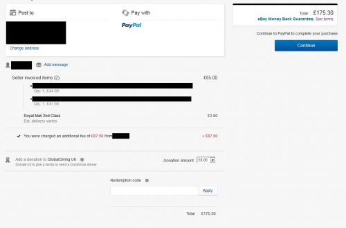 Aztán küld PayPal-on egy Money Request-et a fizetendő összeggel, az Ebay-en meg ott figyel a két kifizetetlen termék. Ez normális így?Aztán kértem, hogy küldje inkább az invoice-ot PayPal-on keresztül, ahogy normális esetben szokott lenni, erre hozzácsapott a fizetendő összeghez még egyszer annyit, mint amennyibe a két termék került, "You were charged an additional fee of £87.50" szöveggel.