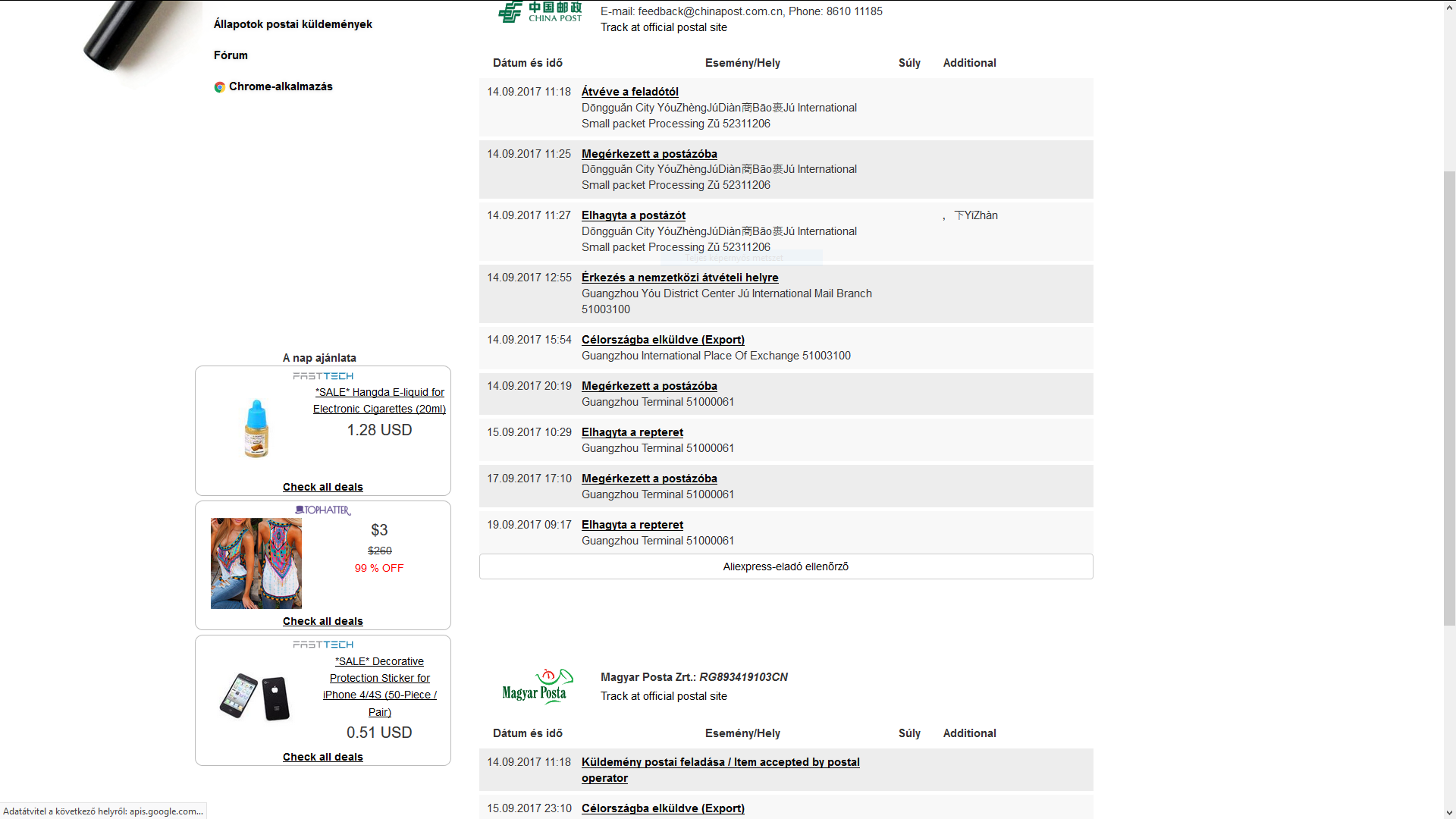 Nos én is rendeltem egy újabb csomagot egy harmadik országból (a felkelő országból), ahol is van nyomkövetés. Most nagy meglepetés ért, ugyanis most vasárnap virradóra megérkezett. Nos mindkét tracking szövegét bemásolom (persze egy kicsit átszerkesztettem a sortöréseket, hogy kevesebbet kelljen görgetni