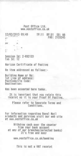 Válogatás az érdekesebb dolgokból időrendben (dőltbetűvel az ő "szavai"):Please find attached the Certificate of Posting from the Post Office showing that the item was dispatched on 12/02/2013 at 09:49.