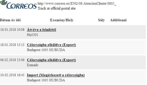 A 17track ugyanazt mutatja, mint a posta. A spanyol posta (correos) pedig ezt: