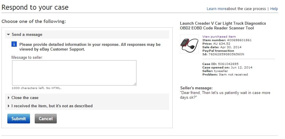 If after 3 business days you don’t hear back from the seller, or are not satisfied with his or her resolution, escalate your case in the Resolution Center so we can help you. You can do so for up to 30 days after you opened the case.