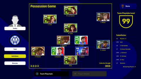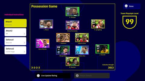 A kép alapján valóban 4-2-3-1nek tűnik, de Nuno Mendes LMF, ezért a középpályára soroljuk be Fernandes mellé, a támadó sor pedig SS Messi, CF Mbappe és LWF Ljungberg. Viszont mint írtam védekezésben tényleg 4-2-3-1, mert Nuno Mendes deep line utasítás miatt LMF helyett LB-t játszik.