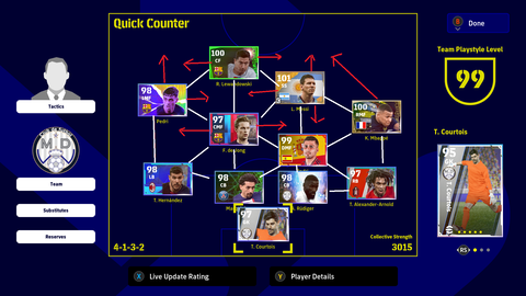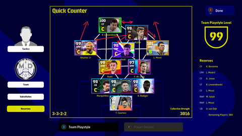 Előre 1 deep lying, 1 advanced CF mögé meg 3 creative playmarker. Lehetne holeplayerre is építeni ha normálisan működne és nem futna el a passzok elől, de mivel nem olyan ezért az csak valamelyik counter taktikában érdemes inkább használni. A CF-ek is valamennyire robbanékonyak, technikásak, de erősek is kell legyenek, pl Benzema Lewa páros, mögöttük Messi, De Bruyne, Pedri. -