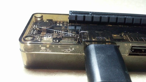Na meg van a PE4L 2.1b. Van két pici kapcsoló a PCIE két oldalán. Azt mire kell majd kapcsolni? Már csak a VGA és egyetlen sata>6pin adapter hiányzik. Szoftveresen meg semmi sincs meg.