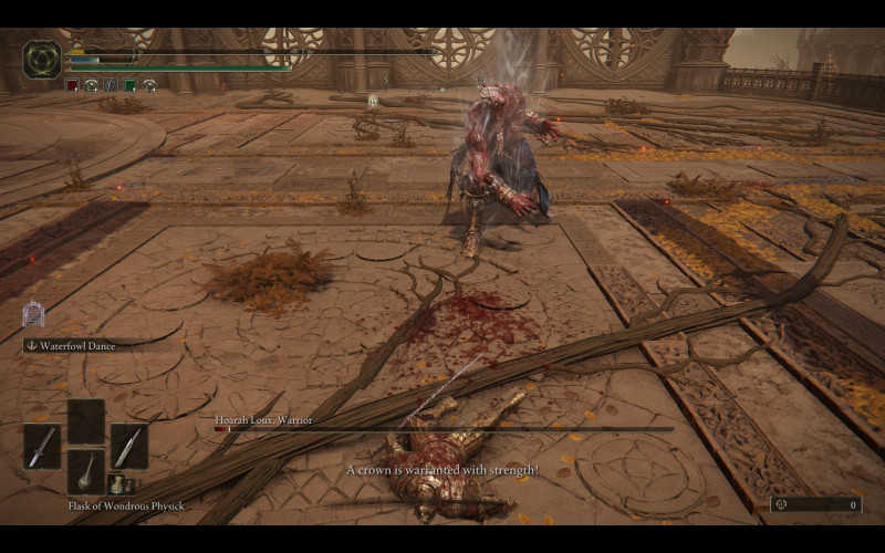 Na, következőre majdnem meglett. Kb. egy heavy (vagy két normál) ütés hiányzott. (Egyúttal kipróbáltam a power stance katana-használatot - uchi és malenia hand páros. Arra legalább jó ez a harc, hogy kísérletezek.)