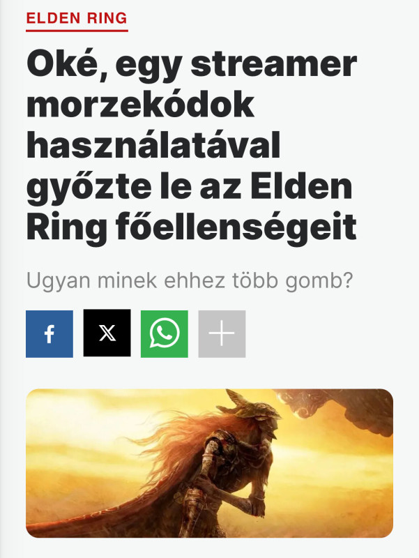 (Azért valami batár nagy str alapú fegyveres buildet megnéznék egyszer majd. Vagy pedig egy veszett gyors dual dagger-eset. De olyat, ahol valamelyik "varázslós" statot is fejlesztem, mert most gyakorlatilag egyetlen varázslat vagy incantation nélkül toltam le a játékot, csak és kizárólag a kezemben tartott fegyverre - no meg esetenként némi grease-re - támaszkodva.)Mindenesetre az ER szvsz remek kapudrog a souls-like műfajhoz, engem behúzott, úgyhogy ma rápihenek, és holnap következik a Dark Souls 1!